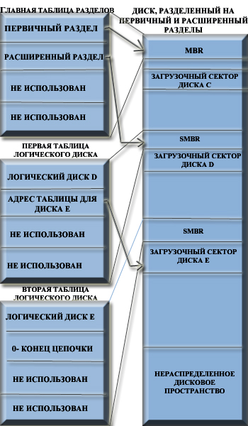 Расширенный раздел содержит вторичную запись MBR (Secondary MBR, SMBR), в состав которой вместо таблицы разделов входит аналогичная ей таблица логических дисков. Эта таблица описывает размещение и характеристики единственного логического диска, а также может указывать на следующую запись SMBR (следующего логического диска) и т. д.