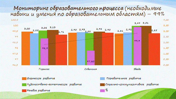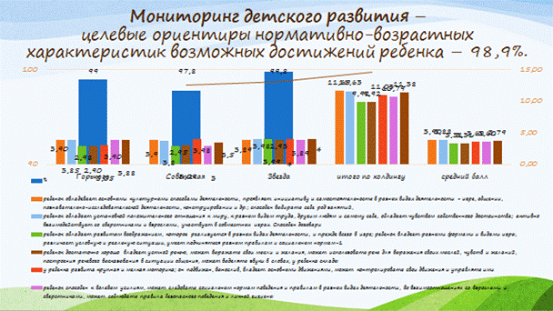 Звезда, 12: На начало учебного года всего обследовано 196 детей 3-7 лет, по результатам обследования на лого пункт зачислены 25 детей с диагнозами ФНР, ФФНР, ОНР-3ур. 98% воспитанников 6-7 лет, нуждающихся в логопедических занятиях (3 детей - отказ родителей от обследования и коррекции) охвачены логопедической помощью.