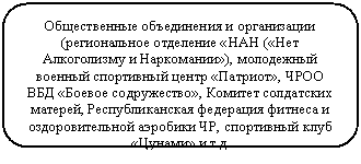 Образовательные учреждения | Спортивные школы | Военный комиссариат | ЧРОО «Боевое содружество | ЧРОО «МВСЦ «Патриот» | Совет ветеранов спорта | Педагоги-организаторы физкультурно-массовой работы по месту жительства | РОСТО - ДОСААФ | Союз ветеранов Афганистана | ДДТ Московского района | Республиканские федерации по видам спорта | Спортивно-туристические клубы | Руководители спортивных сооружений |
