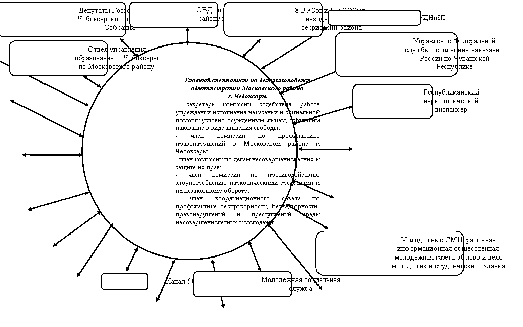 Главный специалист по делам молодежи в своей деятельности по профилактике беспризорности, безнадзорности, правонарушений и преступлений среди несовершеннолетних и молодежи опирается на взаимодействие с организациями, учреждениями и специалистами администрации района.