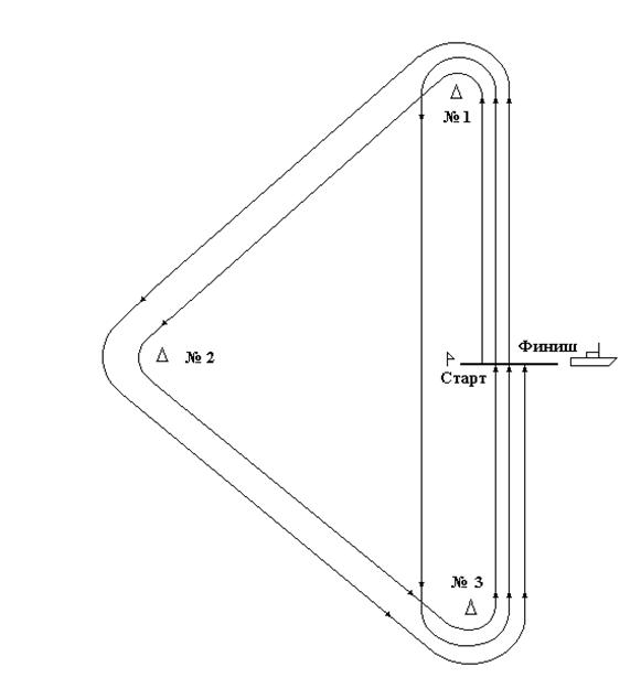 Полная дистанция парусных гонок с рулями – треугольник, петля и треугольник.