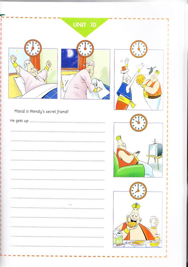 IV. Первичное закрепление нового материала: В упр. 2 приведены словосочетания, которые помогут учащимся вспомнить необходимую лексику и речевой образец “It’s time to…”. Убедитесь, что учащиеся могут правильно назвать время и знают значение словосочетаний. Затем предложите им сказать, что говорит мама Дайно своему сыну.