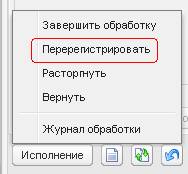 Для перерегистрации ЭД «Договор», необходимо со статуса «Исполнение» выбрать действие «Перерегистрировать»: