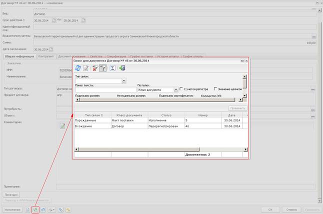 Рис. 22 Кнопка «Связи между документами» ЭД «Договор»