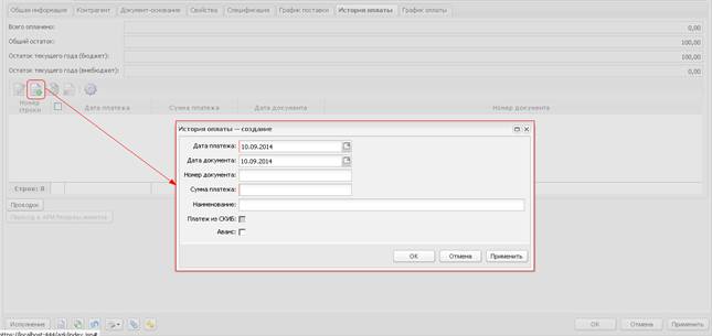 Вкладка «История оплаты», ЭД «Договор»