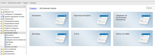Исполнение договора сводиться к отражению информации об оплате (вкладка «История оплаты» договора) и поставке (ЭД «Факт поставки»).