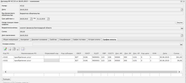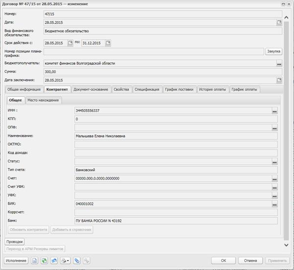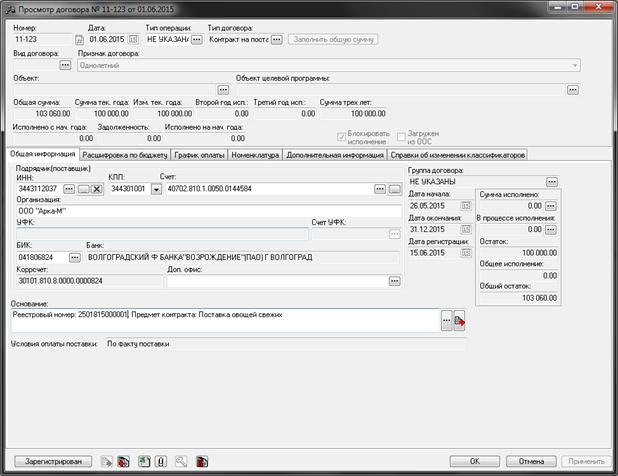 Далее ответственный сотрудник предварительного контроля Облфина проверяет «Новый/Изменённый» Договор на правильность заполнения и обрабатывает до статуса «Зарегистрирован». При этом договор будет выглядеть следующим образом: