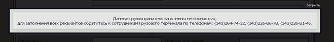 Возможна ситуация, когда грузоотправитель найден по ИНН, но не все необходимые поля заполнены. В данном случае система выдаст следующее сообщение: