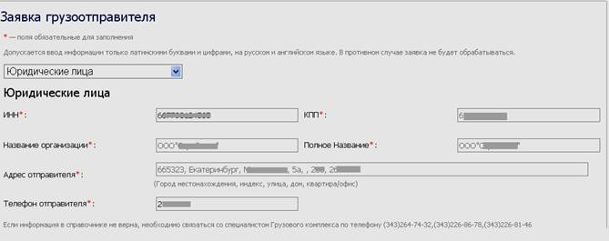 Окно с сообщением необходимо закрыть, все имеющиеся данные попадут в главную форму и можно продолжить заполнение заявки. Для того, чтобы в дальнейшем все реквизиты нужной вам организации были заполнены, необходимо обратиться по указанным телефонам Грузового терминала.