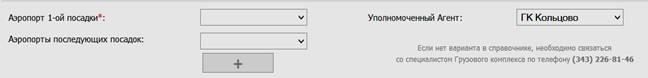 В случае, если Уполномоченным агентом является ГК Кольцово (грузовой комплекс ПАО «Аэропорт Кольцово»), необходимо ввести только Аэропорт(ы) отправки. Количество Аэропортов отправки можно дополнять по кнопке «+»