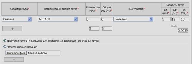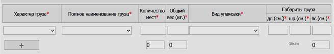 Все поля обязательные для заполнения. Для добавления более одной позиции груза, необходимо нажать на кнопку «+». В случае отсутствия необходимых данных в списках выбора, необходимо связаться с представителями Грузового терминала.