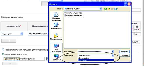 Если в поле «Характер груза», планируемого на отправку, выбрано одно из таких значений, как «опасный», «радиационный», «радиационный тяжеловес», «скоропортящийся», «животные», «груз200», откроется возможность прикрепить и отправить документы необходимые для оправки данного характера груза (декларации и другие сопроводительные документы, подтверждающие безопасность груза).