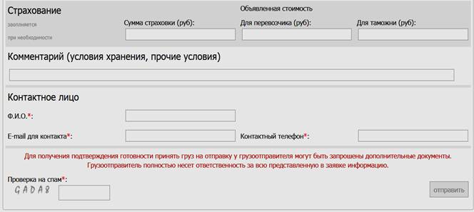 2.9. Заполнение блоков «Страхование», «Комментарии», «Контактное лицо», «Проверка на спам». Данные вносятся вручную.
