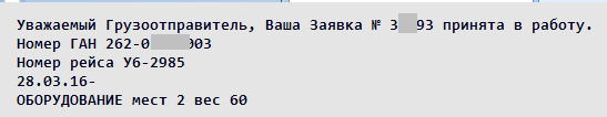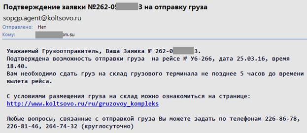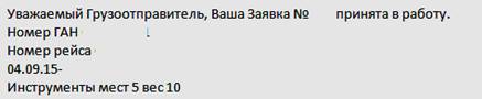 После рассмотрения Заявки работниками грузового комплекса на электронный адрес отправителя будет направлено сообщение о подтверждении следующего вида: