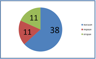 38 педагогов имеют высшую квалификационную категорию, 11 - первую и 11- вторую квалификационную категории.
