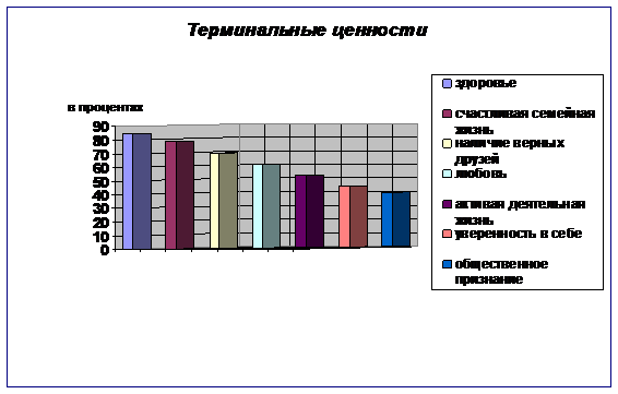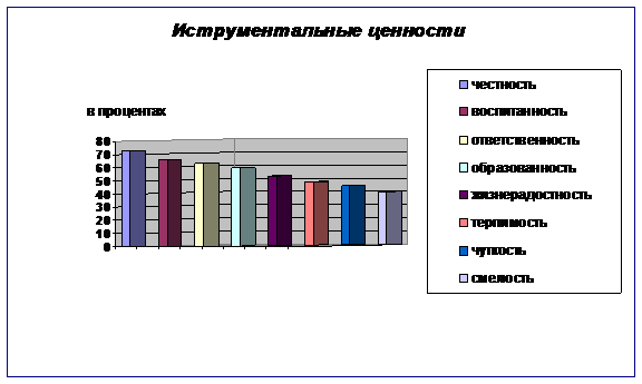 Исходя из полученных данных исследования инструментальных ценностей, можно сделать вывод, что для молодежи наиболее значимыми, важными являются гуманистические ценности, такие как честность, воспитанность, образованность, терпимость, чуткость и т. д. Далее следуют эмоционально-волевые (жизнерадостность, воля, смелость и активность) и прагматические ценности (рациональность, исполнительность, дисциплинированность и независимость).