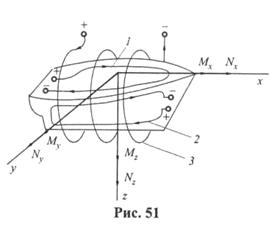 Под влиянием трех составляющих магнитного поля Земли корпус судна приобретает индуктивную намагниченность, которую можно представить тремя векторами: Мx, Мy, Мz (рис. 7.1), причем: