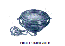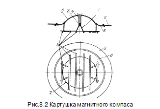 Чувствительный элемент магнитного компаса УКПМ-М (рис.8.1) представляет собой шестистрелочную магнитную систему (рис.8.2), помещенную в котелок с поддерживающей жидкостью. Чувствительный элемент имеет круговую шкалу для отсчета курса судна. Магнитная система со шкалой называется картушкой магнитного компаса, центрируемой при помощи шпильки.