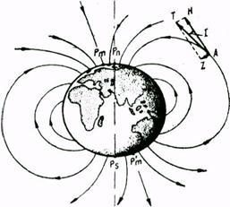 Земное магнитное поле в первом приближении представляет собой поле однородно намагниченного шара, или диполя, помещённого в центре Земли и наклонённого к оси её вращения на угол 11,5˚. Ось этого диполя пересекает земную поверхность в точках Рm и Рm‛, которые называются геомагнитными полюсами.