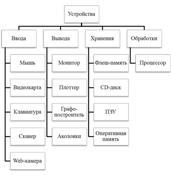 Устройства: процессор, монитор, флеш-память, мышь, плоттер, видеокамера, сканер, CD-диск, графопостроитель, Web-камера, ПЗУ, оперативная память, акустические колонки, клавиатура.