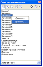 В открывшемся окне «Стили и форматирование» выделить нужный стиль, нажать правую кнопку мыши и в появившемся меню выбрать пункт «Изменить» (см. рис. 2). Появится окно редактирования стиля.