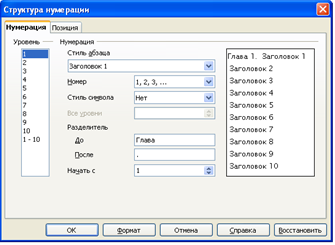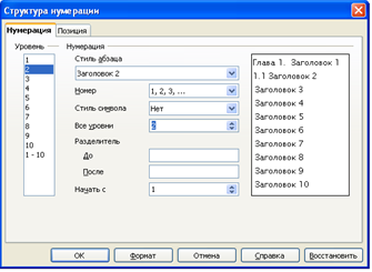 Для автоматической нумерации заголовков выбираем пункт «Сервис»–«Структура нумерации». В появившемся окне производим все необходимые настройки.