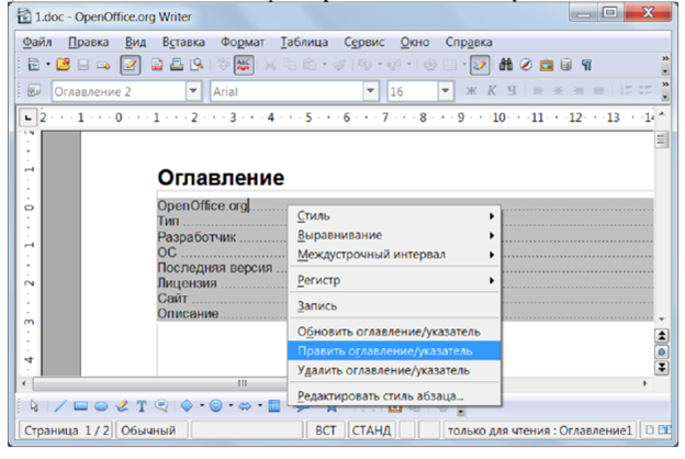 В любой момент после добавления оглавления можно изменять его параметры и вид представления (отображения). Для этого необходимо вызвать контекстное меню для данного объекта, как показано на Рис. 7 и выбрать пункт Править–Оглавление/указатель.