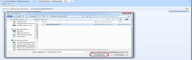 После чего, в всплывающем окне, осуществляется выбор файл платежного поручения (мемориального ордера) и двойным щелчком или при помощи кнопки «Открыть» запускаете процедура приема выбранного файла.