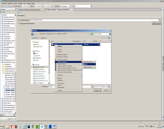 Перед загрузкой файла платежного поручения в программу Смарт-бюджет есть возможность просмотреть его структуру на соответствие установленным требованиям. Для этого при приеме файла документа «Черновик – Платежное поручение (выплаты) (См. п.1), необходимо встать курсором на файл и нажать правую кнопку мыши, из появившегося меню выбрать из режим «Открыть с помощью» и выбрать программу «Блокнот».