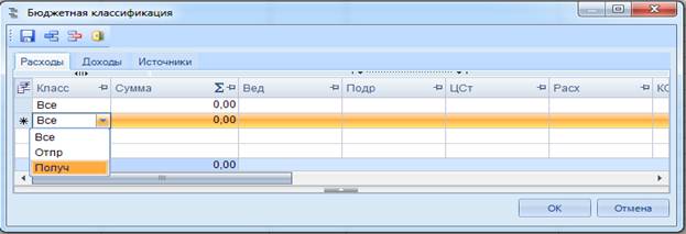 Выбирается классификация на разных вкладках окна выбора Бюджетной классификации ![]()