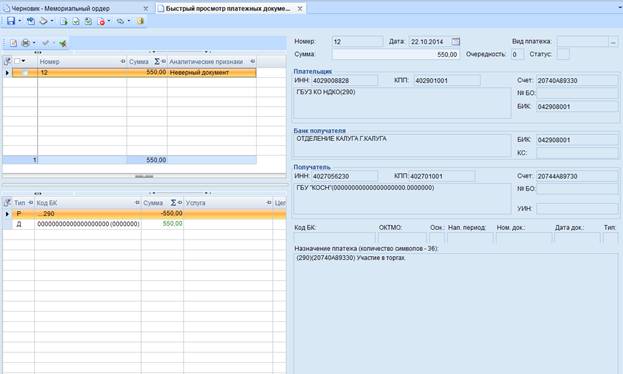 При приеме файла документа «Мемориальный ордер» в Программу документ может быть сразу автоматически забракован (при просмотре принятого документа в режиме «Черновик – Мемориальный ордер» документ в списке забракованных).