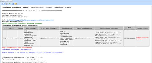документ пройдет все автоматические контроли Программы как и при приеме документа «Платежное поручение». Программа автоматически изменит наименование Отправителя и Получателя, заполнит поле «Назначение платежа» документа и Код БК, соответственно требования министерства финансов области.