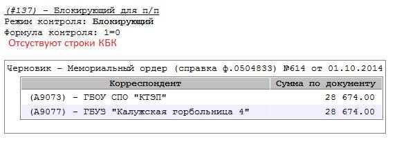 Другая серьезная ошибка: не заполненное поле 104 КБК получателя (в примере выше выделенно зеленым цветом). Заполнение данного поля обязательно для документов «Мемориальный ордер»