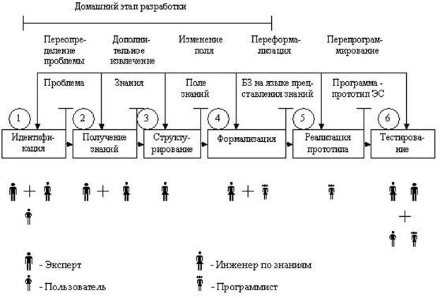 Объем прототипа - несколько десятков правил, фреймов или примеров. На рис. 6 изображены шесть стадий разработки прототипа и минимальный коллектив разработчиков, занятых на каждой из стадий (пять стадий заимствованы из). Приведем краткую характеристику каждой из стадий, хотя эта схема представляет грубое приближение к сложному итеративному процессу.