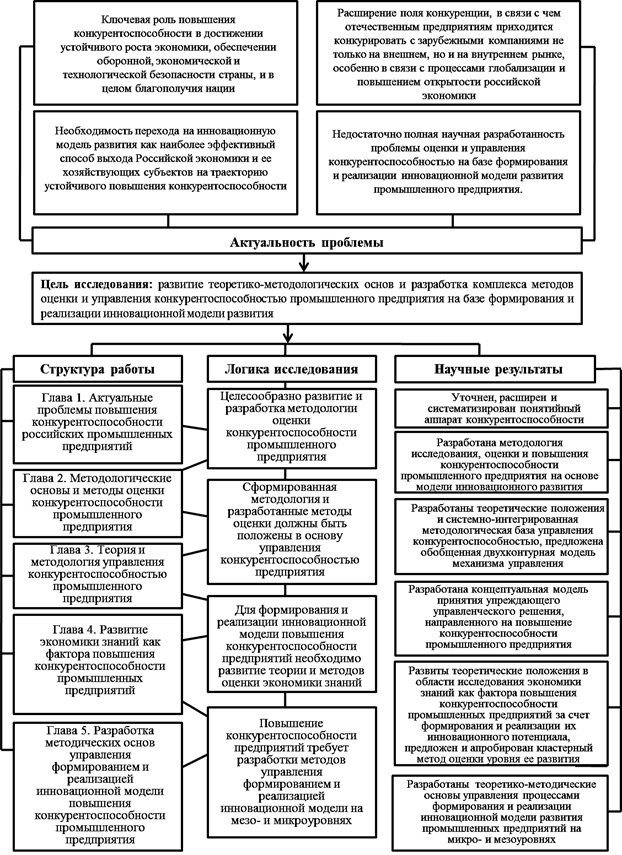 В первой главе «Актуальные проблемы повышения конкурентоспособности российских промышленных предприятий» рассмотрены основные концепции конкурентоспособности и роль последней в инновационном развитии экономики страны, сформулированы требования и дано определение конкурентоспособности предприятия, определены взаимоотношения конкурентоспособности различных экономических субъектов и объектов, систематизированы подходы к оценке конкурентоспособности, проведен обзор методических подходов к управлению конкурентоспособностью предприятия.