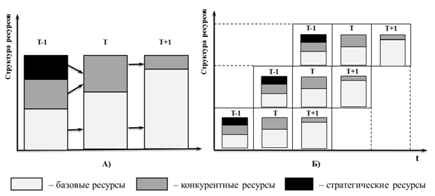 В ситуации запаздывания, когда в надежде на длительное сохранение завоеванных в прошлом конкурентных преимуществ предприятие не принимает упреждающих решений по изменению, структура ресурсов меняется так, как это показано на рис. 7А, в то время как принятие упреждающего решения позволит сохранить и увеличить долю стратегических и, как минимум, обновить или расширить конкурентные ресурсы (рис. 7Б).