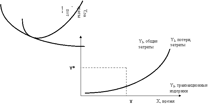 Зависимость роста транзакционных издержек от срока введения изменений в деятельность предприятия обозначена через Y2, а совокупные издержки, включающие сумму потерь и дополнительных затрат от запаздывания с принятием решения (Y1) и транзакционных издержек, связанных с упреждающим решением (Y2), обозначены как Y3 (рис. 8).