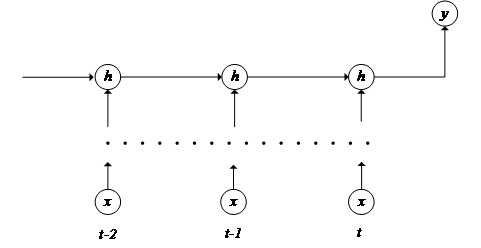 Классом моделей, успешно решающих проблему нефиксированной последовательности входных данных, являются рекуррентные нейронные сети (Recurrent Neural Network, RNN) [4; 7]. При помощи скрытого слоя h модель может сохранять информацию о предыдущих входных сигналах, а по окончании последовательности данных проводить классификацию тональности (рис. 1).