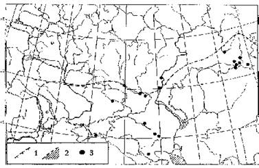 Рис. 1. Гнездовой ареал розового скворца в Восточной Европе по данным (1954) и в настоящее время (Костин, 1983; Белик, 1993 и др.): 1 — северная граница ареала в первой половине XX в.; 2 — предельная граница пульсации ареала в 1980-е гг.; 3 — место постоянного гнездования в Крыму.