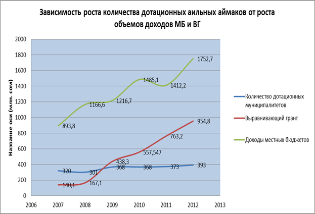 Данные показывают, что реальное снижение количества дотационных айылных аймаков произошло с 2007 по 2008 г. г., т. е. период, который справедливо считается «золотым» временем развития МСУ в Кыргызской Республики. В последующие годы наоборот наблюдается рост количества дотационных айылных аймаков и к 2012 году их количество достигает 393, что превышает показагода, при том, что общее количество сельских муниципалитетов сократилось за этот же период с 472 до 459.