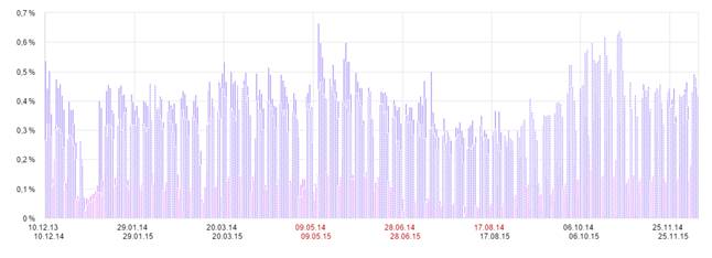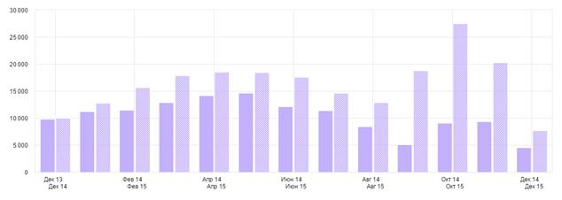 1. c 10 декабря 2014 по 10 декабря 2015 ежемесячный рост количества посетителей вырос до 3,5% относительно того же периода с 10 декабря 2013 года по 10 декабря 2014 года составил 2%, что отражено на Рисунок 11;