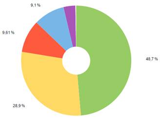 3. основной траффик приходится на поисковые системы – составляет 48,7% от общего притока посетителей, около 29% посещений происходит за счет прямых заходов, оставшиеся 19% - переходы по ссылкам на сайтах, заходы из социальных сетей, внутренние переходы, см. Рисунок 12