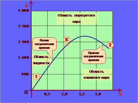 На диаграмме нанесены пограничные кривые и ряд линий, характеризуемых постоянным значением того или иного параметра. Линия 1-К представляет левую пограничную кривую; линия К-2 –правую пограничную кривую. Между пограничными кривыми находится область влажного пара, выше – область перегретого пара. Область жидкости расположена слева от пограничной кривой кипящей жидкости 1 – К.