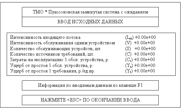 В зависимости от характера системы пользователь должен выбрать нужную альтернативу — систему 1, 2, 3, 4. Система 1 — это пуассоновская система, замкнутая, (с ограниченным числом обслуживающих приборов) с ожиданием. Для того чтобы воспользоваться соответствующей программой надо ввести следующие данные. Пользовательский интерфейс ввода данных по данной подпрограмме (замкнутая система МО с ожиданием) показана на рис. 2.