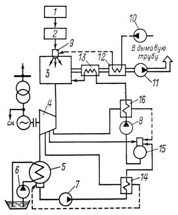 | Рисунок 3.1. Принципиальная технологическая схема КЭС: 1‑склад топлива и система топливоподачи; 2‑система топливоприготовления; 3‑парогенератор; 4‑турбина; 5‑конденсатор; 6‑циркуляционный насос; 7‑конденсатный насос; 8‑питательный насос; 9‑горелки парогенератора, 10‑вентилятор; 11‑дымосос; 12‑воздухоподогреватель; 13‑водяной экономайзер; 14‑подогреватель низкого давления; 15‑деаэратор; 16‑подогреватель высокого давления. |