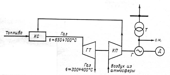 КС - камера сгорания; КП - компрессор; ГТ - газовая турбина; Г - генератор; Т - трансформатор; Д - пусковой электродвигатель.