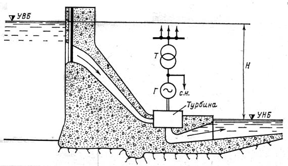 Для увеличения напора Н создаются искусственные гидротехнические сооружения. На равнинных реках напор создается с помощью плотины. Водное пространство перед плотиной называется верхним бьефом, а ниже плотины - нижним бьефом (рисунок 3.4). Разность уровней верхнего (УВБ) и нижнего бьефа (УНБ) определяет напор Н. В состав гидроузла на равнинной реке входят: плотина, здание электростанции, водосбросные, судопропускные (шлюзы), рыбопропускные сооружения и др.