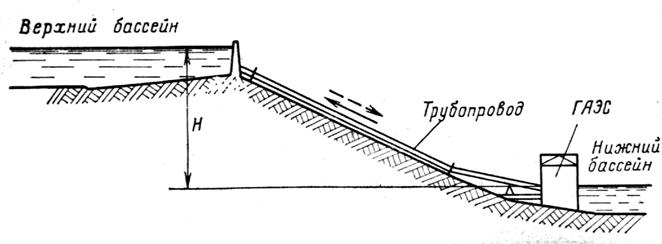 В здании ГАЭС устанавливаются так называемые обратимые гидроагрегаты. В часы минимума нагрузки энергосистемы генераторы ГАЭС переводят в двигательный режим, а турбины - в насосный. Потребляя мощность из сети, такие гидроагрегаты перекачивают воду по трубопроводу из нижнего бассейна в верхний. В период максимальных нагрузок, когда в энергосистеме образуется дефицит генераторной мощности, ГАЭС вырабатывает электроэнергию. Сбрасывая воду из верхнего бассейна, турбина вращает генератор, который выдает мощность в сеть.