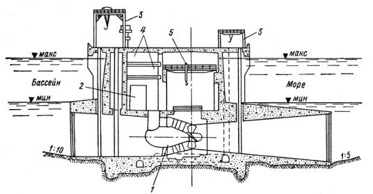 ПЭС вырабатывают электрическую энергию за счет использования потенциальной энергии приливов и отливов моря. Величина прилива (в результате притяжения Луны) в разных местах Земли неодинакова: у берегов Америки она составляет 21 м, у берегов Франции и Англии – порядка 15 м, у берегов России – 8–11 м на Белом и Охотском морях. Установлено, что использовать энергию приливов целесообразно уже при 3–4 м высоты прилива.