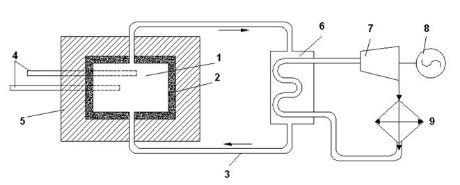 1 — активная зоня; 2 — отражатель; 3 — трубы; 4 — поглотитель нейтронов; 5 — бетонная защита; 6 — теплообменник-парогенератор; 7 — турбина; 8 — генератор; 9 — конденсатор